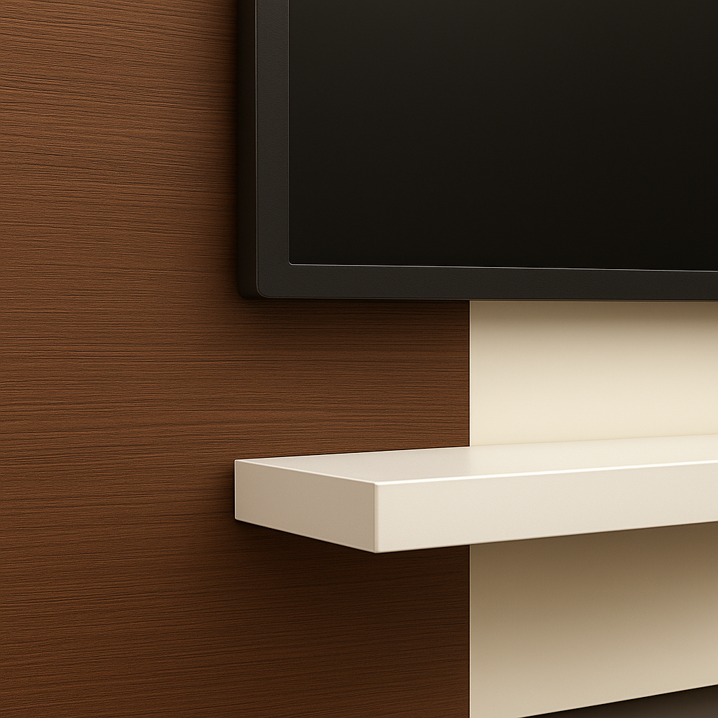 - Optional set-top box shelf or tray, and panel cutouts for HDMI, power access, or device storage integration.